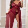 Undeniable sexy empire waist front open sheer long dress with guipure lace bustier and criss cross details. The back is open and waist closed by satin ribbon giving the perfect rear view. Includes matching panty.