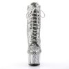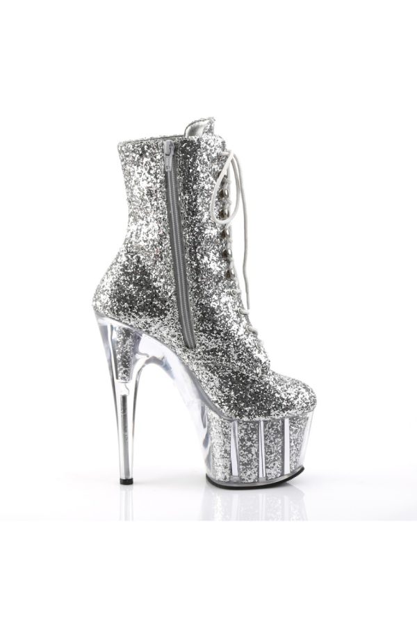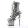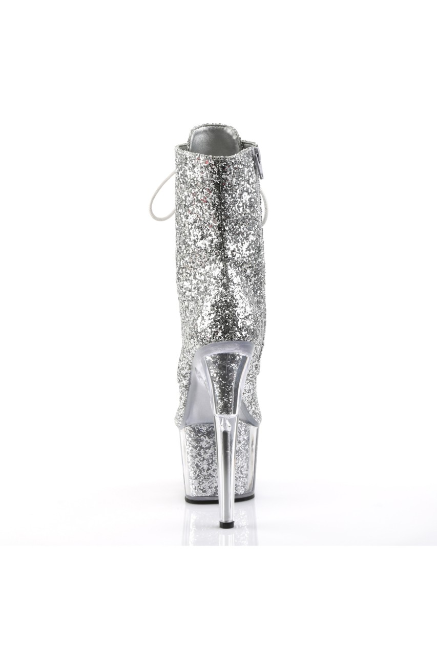 7″” (17.8cm) Stiletto Heel, 2 3/4″” (7cm) Glitter-filled Platform Front Lace-Up Ankle Boot, Inner Side Zip Closure
