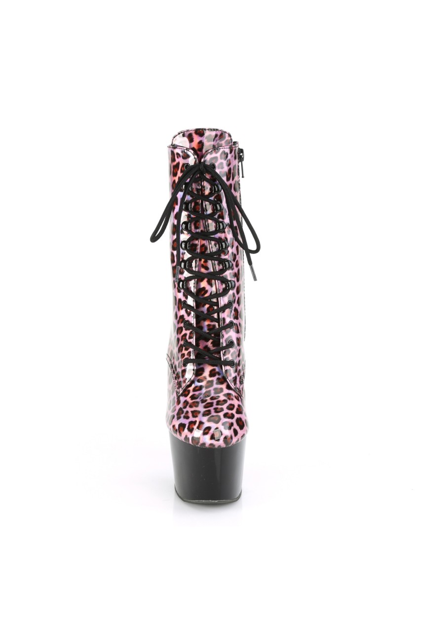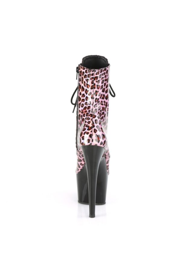 7″” (178mm) Heel, 2 3/4″” (70mm) Platform Lace-Up Front Ankle Boot w/ Holographic Leopard Print Upper, Inner Side Zip Closure