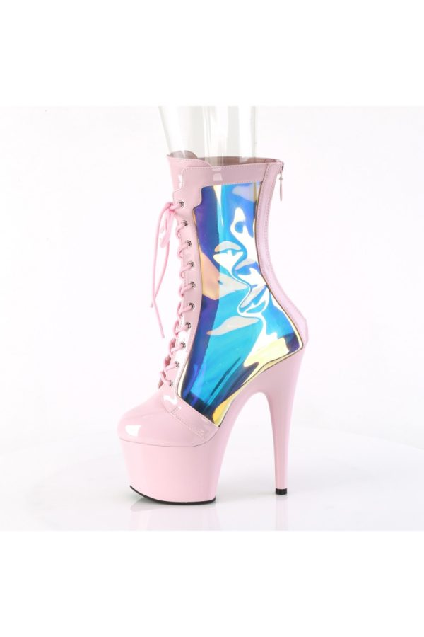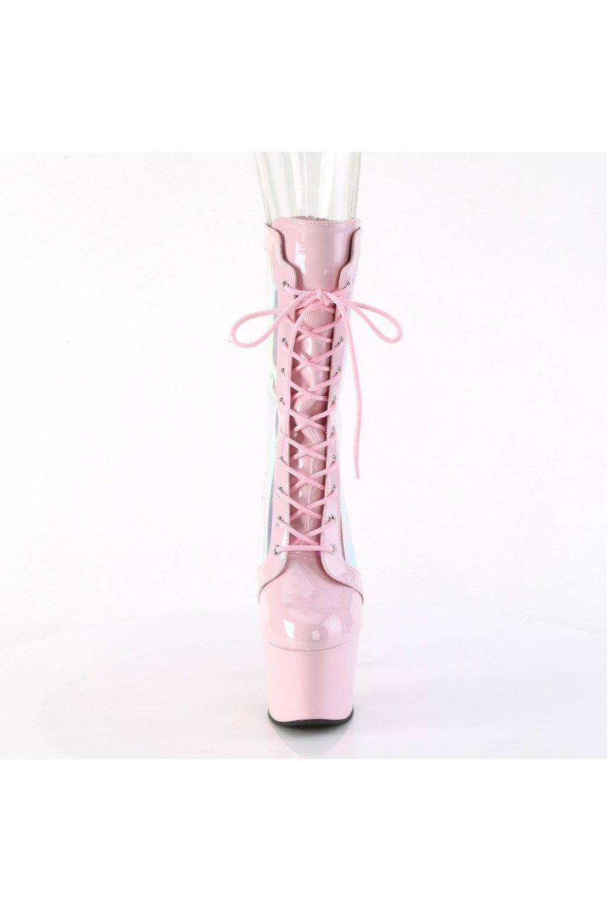 7″” (178mm) Heel, 2 3/4″” (70mm) Platform Lace-Up Front Mid Calf Boot Featuring Holographic Side Panels, Back Zip Closure
