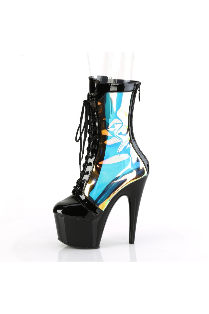 7″” (178mm) Heel, 2 3/4″” (70mm) Platform Lace-Up Front Ankle Boot Featuring Holographic Side Panels, Back Zip Closure