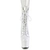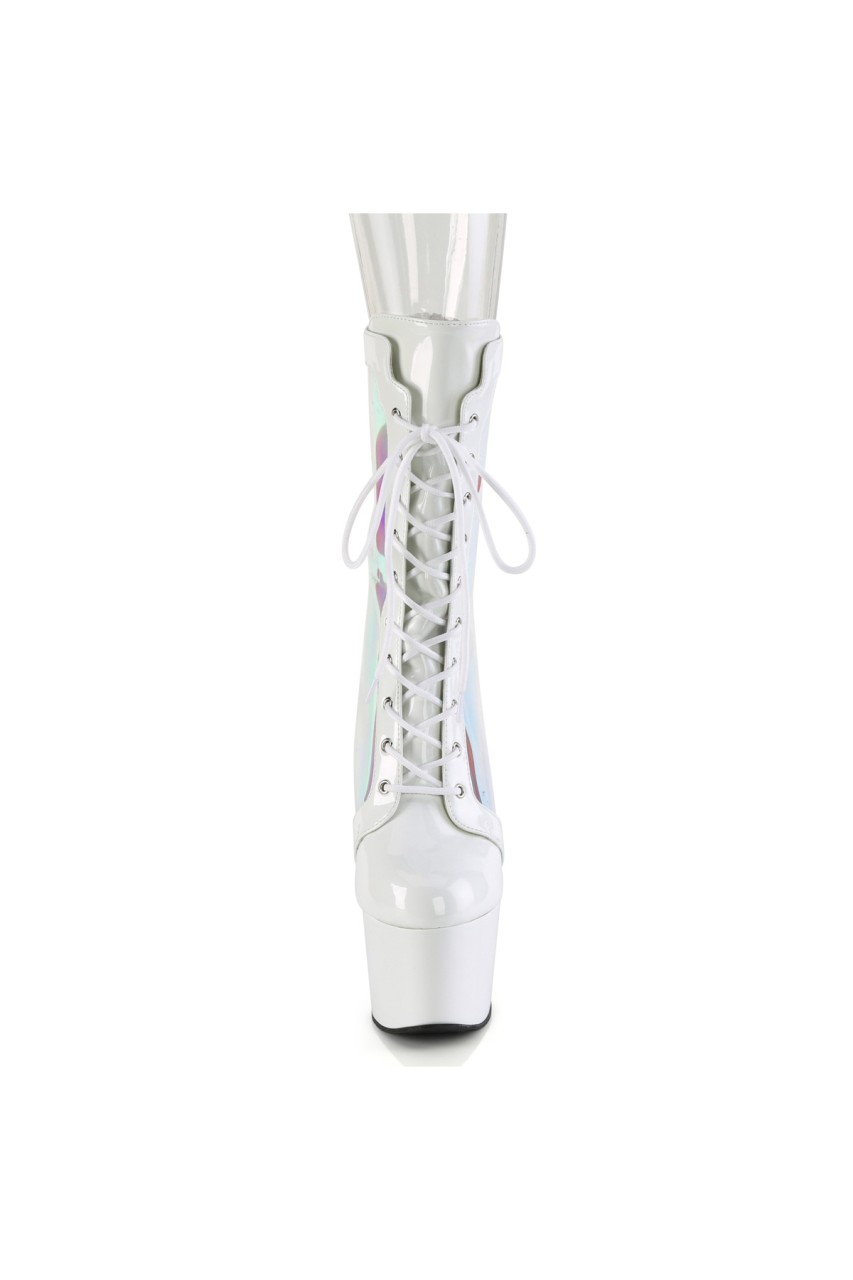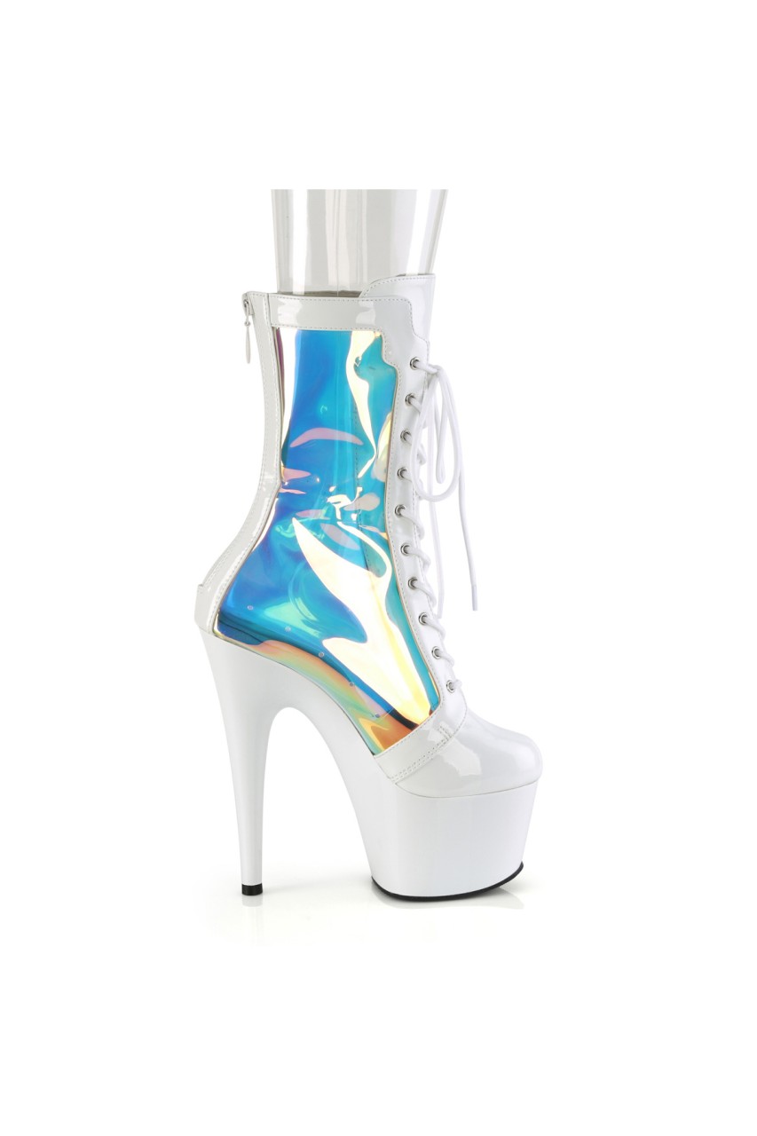 7″” (178mm) Heel, 2 3/4″” (70mm) Platform Lace-Up Front Ankle Boot Featuring Holographic Side Panels, Back Zip Closure