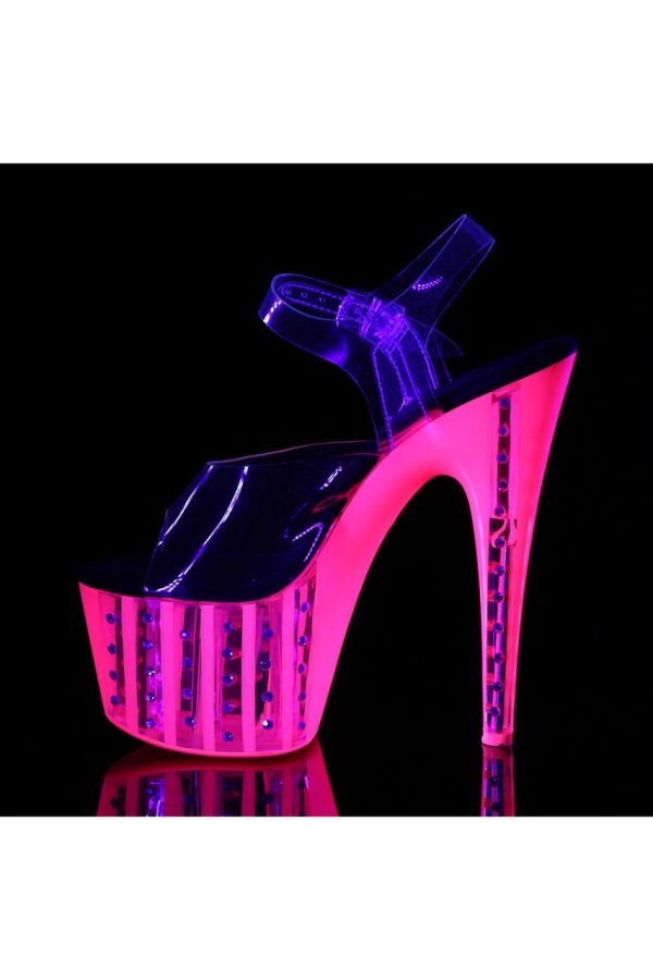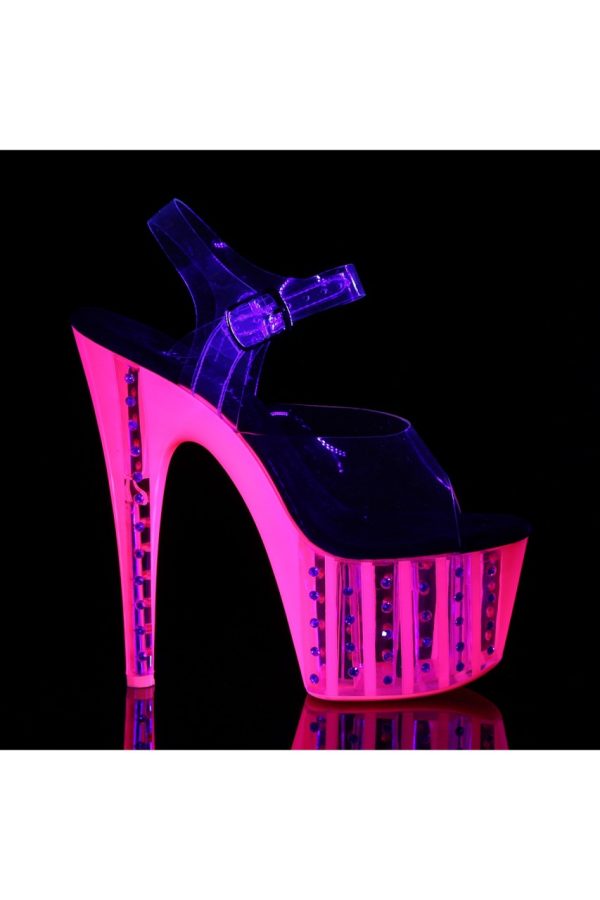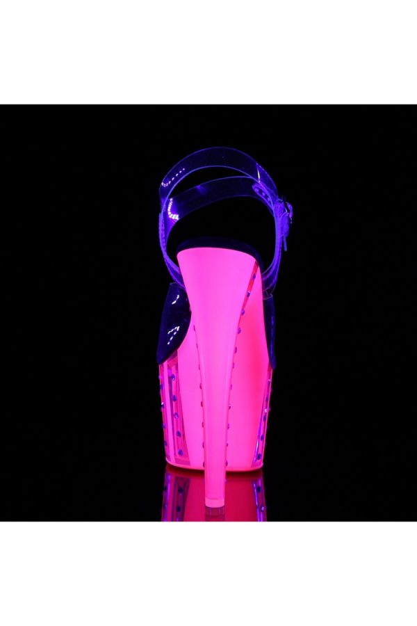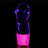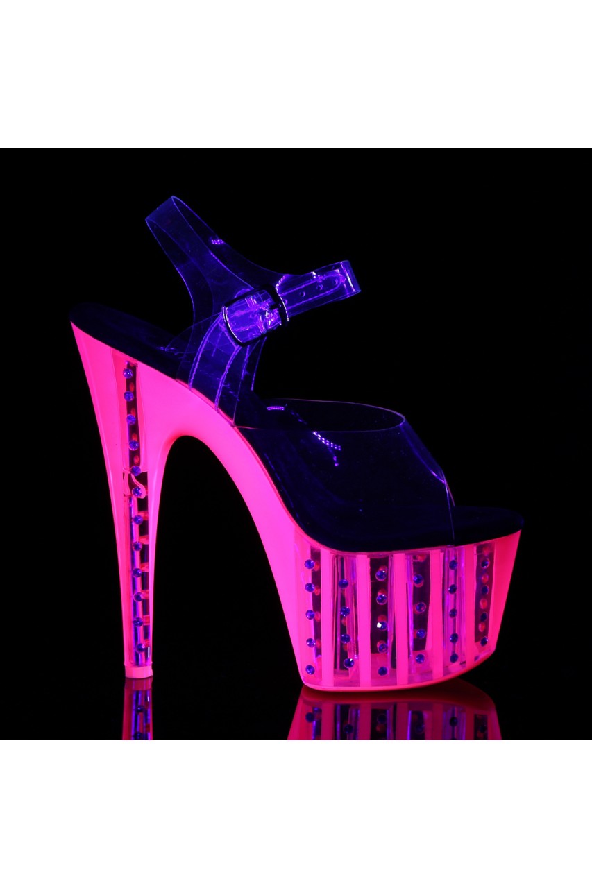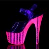 7″” (17.8cm) Stiletto Heel, 2 3/4″” (7cm) Platform Ankle Strap Sandal Featuring Neon UV Reactive Rhinestone Lined Platform