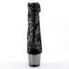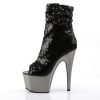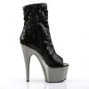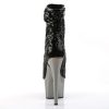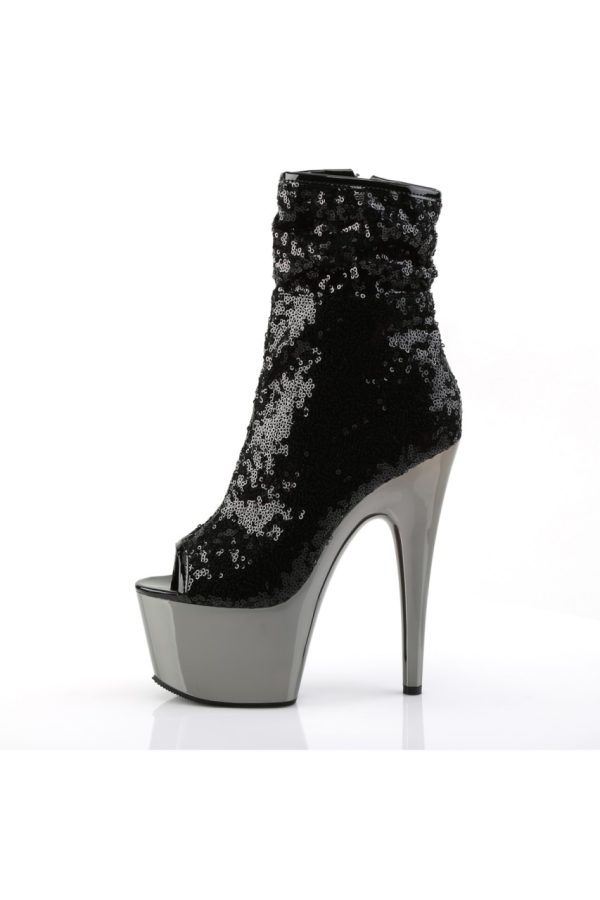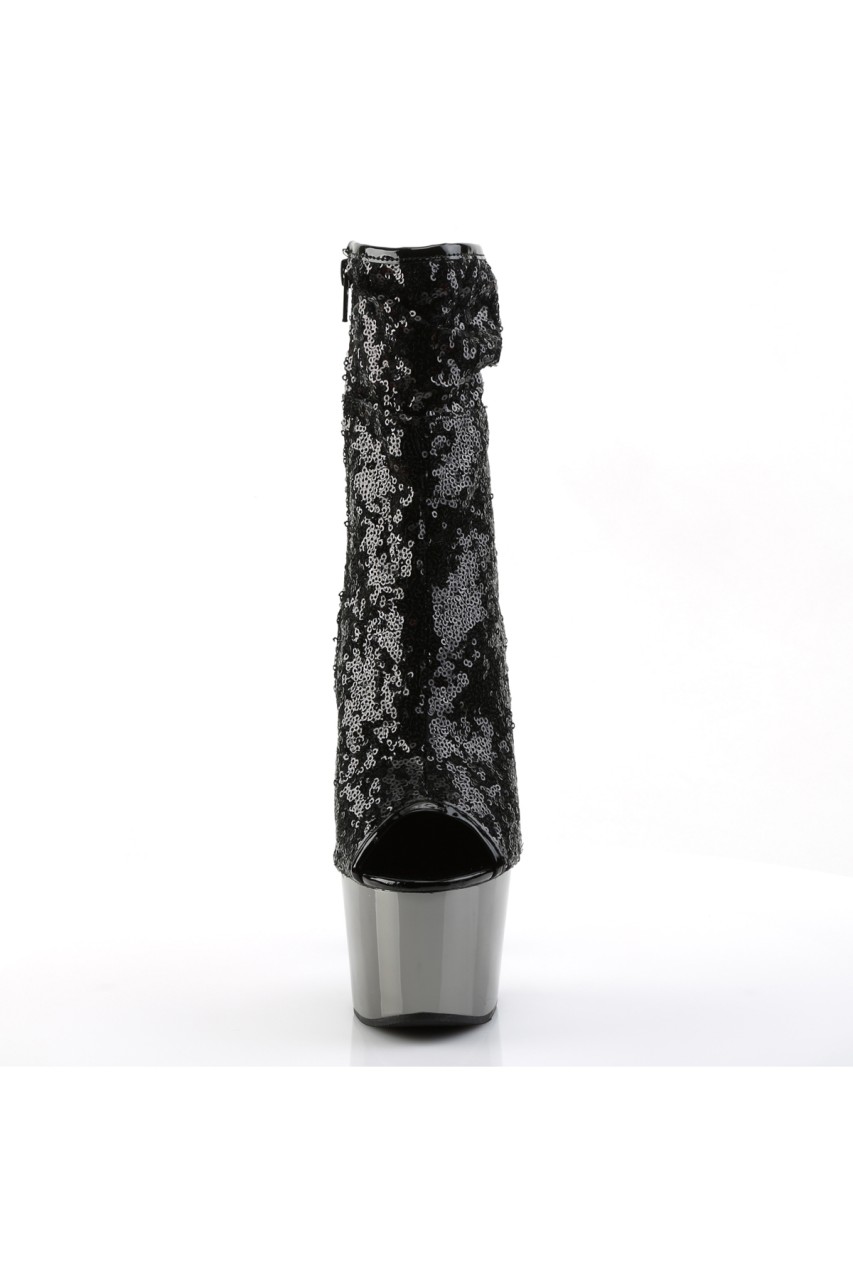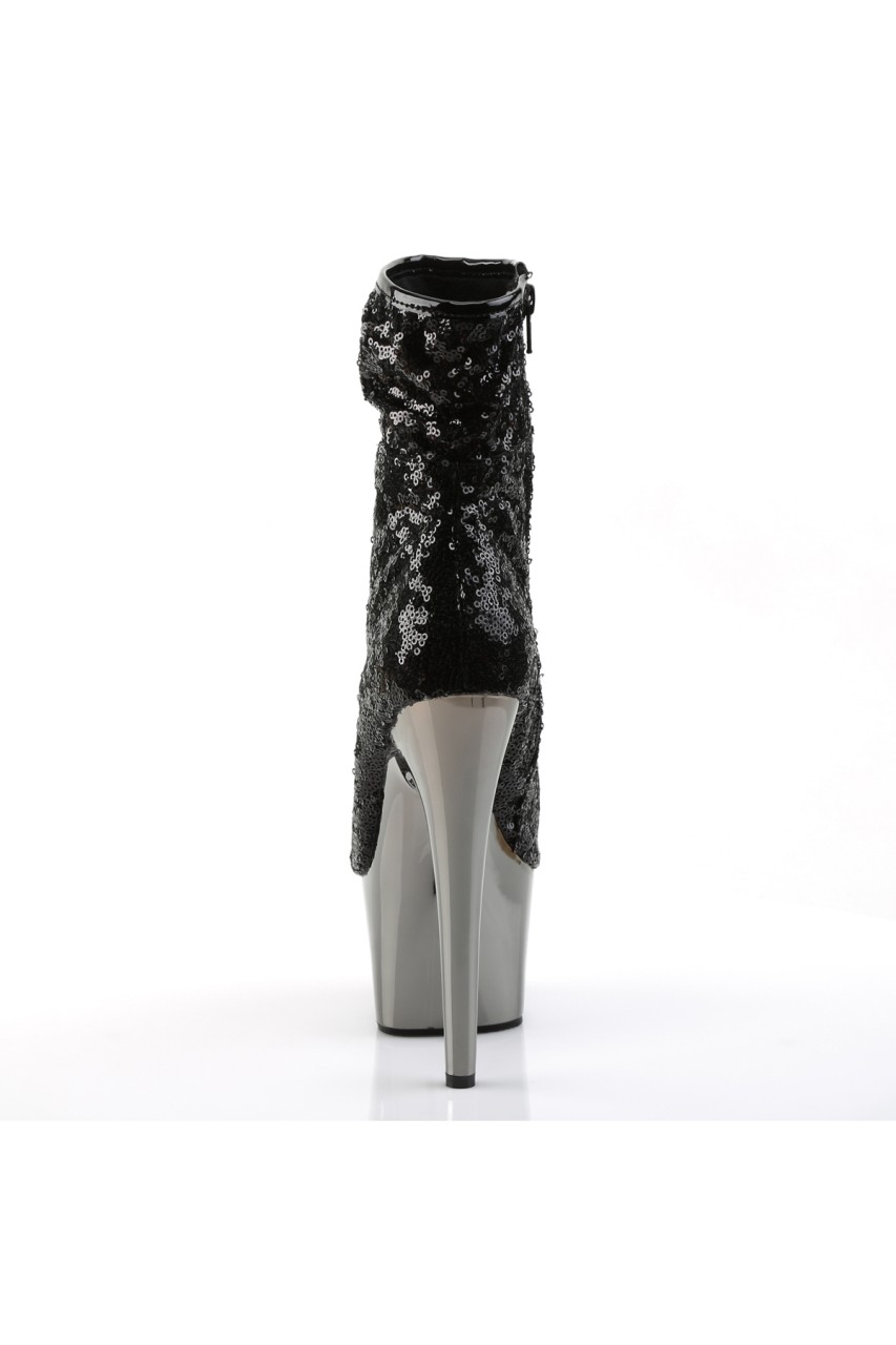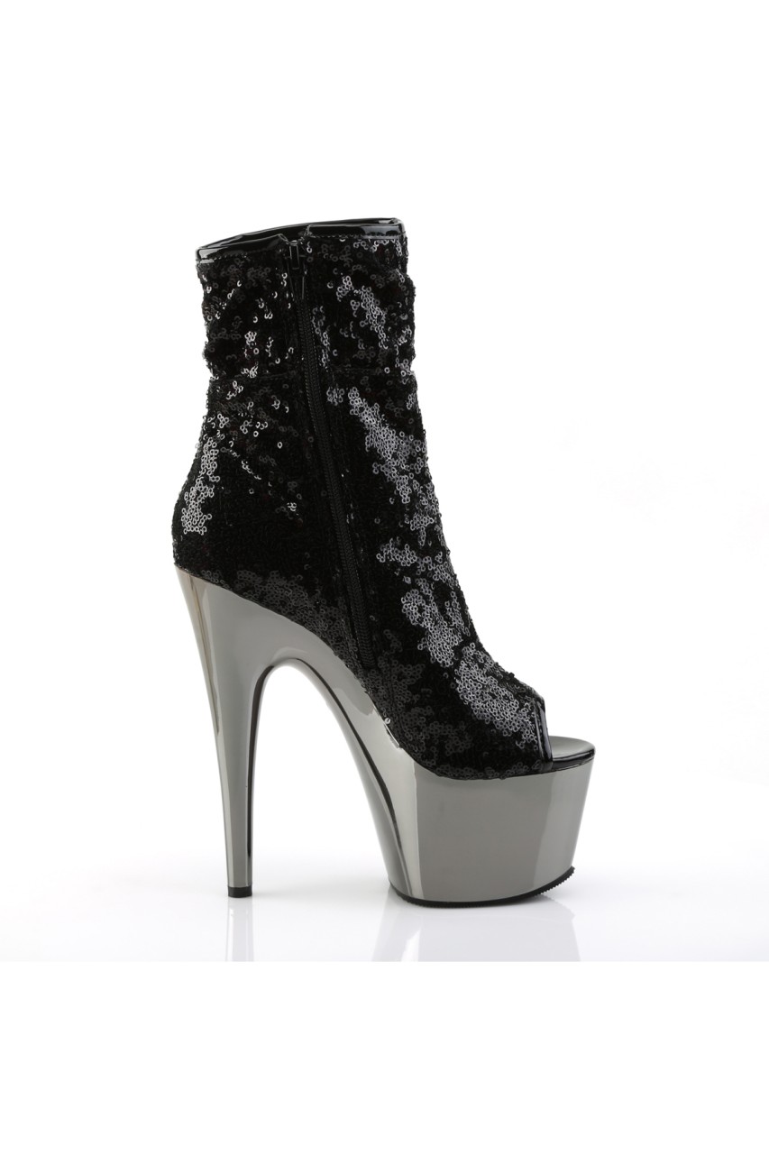 7″” (17.8cm) Stiletto Heel, 2 3/4″” (7cm) Chrome Plated Platform Peep Toe Ruched Shaft Ankle Boot, Inner Side Zip Closure