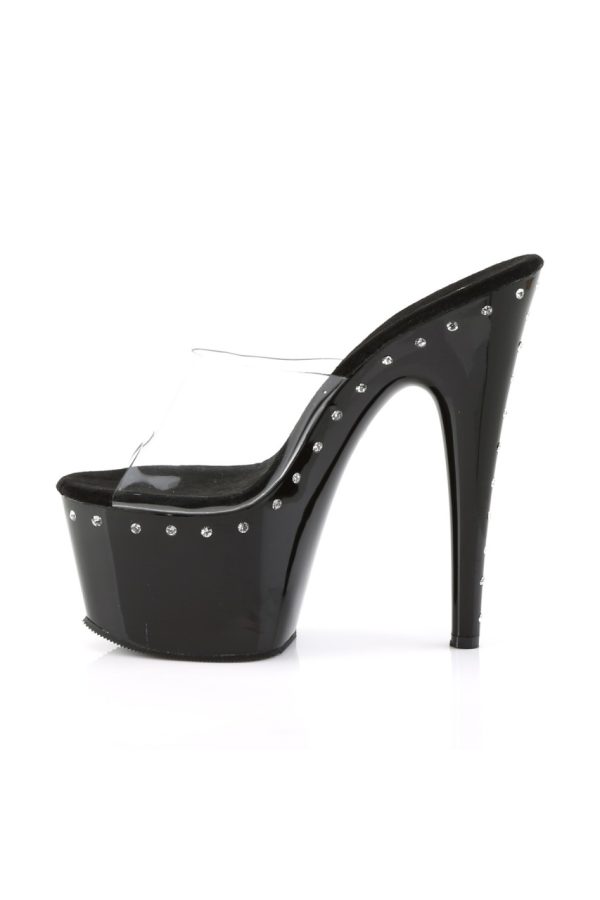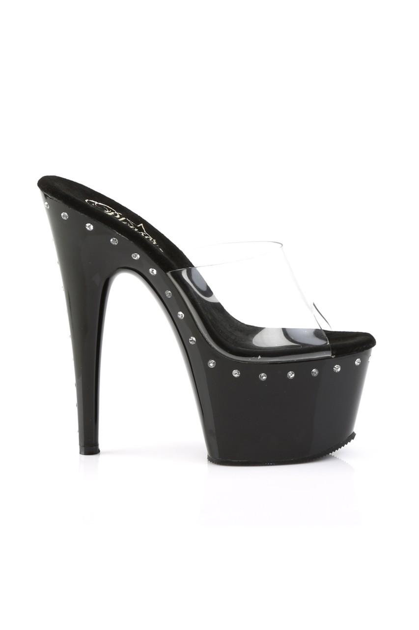7″” (17.8cm) Stiletto Heel, 2 3/4″” (7cm) Platform Slide Featuring 1 Line of Rhinestone on Platform and Heel