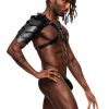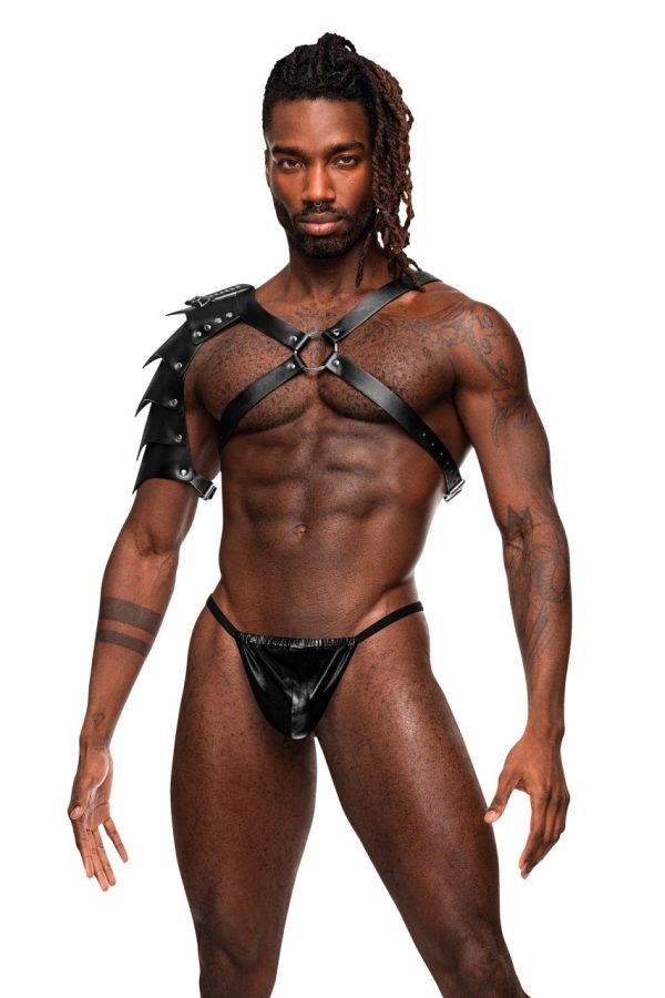 From the Leather collection by Male Power, this style includes a criss crossing chest harness with a gladiator inspired, bendable shoulder shield, fully adjustable buckled straps, metal rings and studs. Soft Nubuck Leather with Polyurethane coating, heavy metal rings, buckles, and studding. Do Not Wash, Do Not Bleach, Do Not Tumble Dry