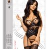 A stunning corset made from black leather look stretch fabric with lace. Bra top fastening with adjustable straps. The corset has a lacer up affect at the back, matching panties and adjustable suspender straps (please note the stockings are not included but we have a selection to choose from separately). Shaina Corset set set arrives packaged in an elegant box with the picture presenting the product and is marked with the hologram from the logo Beauty Night Fashion. Bag-pouch for storage or laundry included.