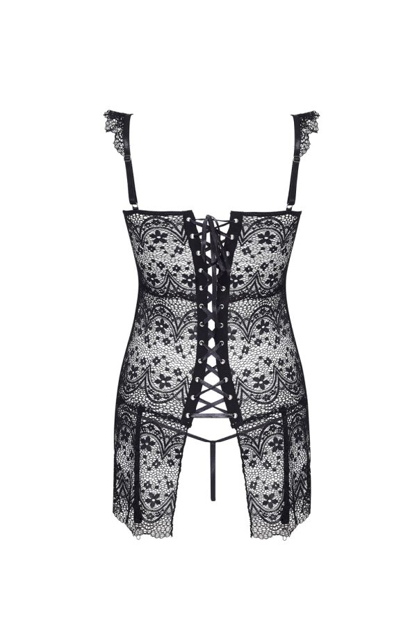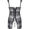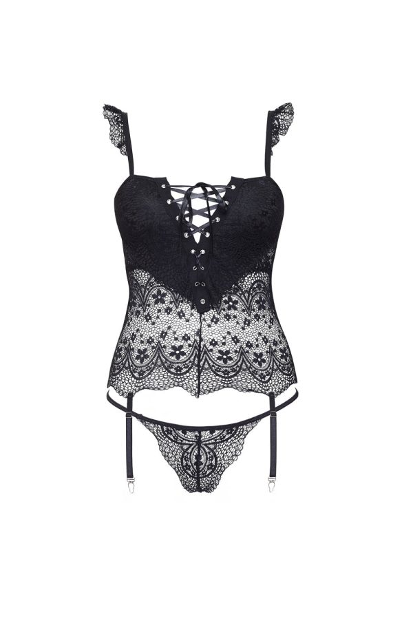 Beautiful black corset with satin ribbon lace up front and back features. The stunning lace has back panels which are longer than the front adding to its unique design. The suspender belts are adjustable and the thong is included. Another stunning design from Beauty Night. Also arrives packaged in a Beauty Night box. (please note that the stockings are not included but are available separately).