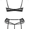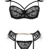 Discover a unique and captivating three-piece lingerie set designed to enchant. The set features an adjustable underwired bra adorned with feather effect shoulder strap detail, offering both support and a touch of glamour. The suspender belt is embellished with striking chain details and feather effect to match the bra, adding an edgy, sophisticated flair. Completing the look are leg straps with matching chain accents and a coordinating thong. This extraordinary set combines luxurious materials and bold design elements for a truly unforgettable set. Arrives packaged in a Beauty Night box.