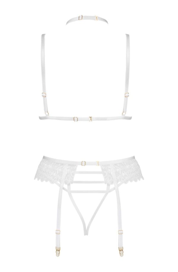 Discover the enchanting Noemi Lingerie Set in white. Featuring a bra, open thong, and garter belt. Crafted from delicate white lace, this set accentuates your natural beauty and exudes femininity and sensuality. Key Features: High-Quality Lace: Exquisite and delicate, adding a luxurious touch. Colour White: Elegantly highlights natural beauty. Transparent Materials: Lightly envelop the body Adjustable Straps and Fastenings: Ensure an ideal fit. Intricate Lace Detailing: Elegantly enhances the bra and thong Comfortable Fit: Designed for all-day and all-night wear. Elegance and Sophistication: Boosts confidence Ideal Gift: Packaged in an elegant box with product photos, perfect for gifting. The Noemi white Set is a perfect gift, combining elegance and sensuality to make every woman feel special and appreciated.