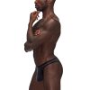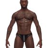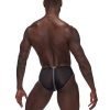 From the Landing Strip collection by Male Power, the Bikini Brief, features thin plush elastic trim on waist and legs, tone on tone matt onyx insert strip through the pouch and rear and a decorative metallic brand label on rear waistband. Sheer stretch mesh poly spandex with a stretch faux leather insert and plush elastic trim. Hand wash separately, cold water, line dry, no bleach
