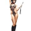 This monokini with opulent, gold flower embroidery appears black as night and gently caresses your body. The mixed material made of lace and tulle appliqu?s, along with its revealing rear side and flexible, tieable bands is worth more than a sin. One size fits all; Color: Black-Gold.