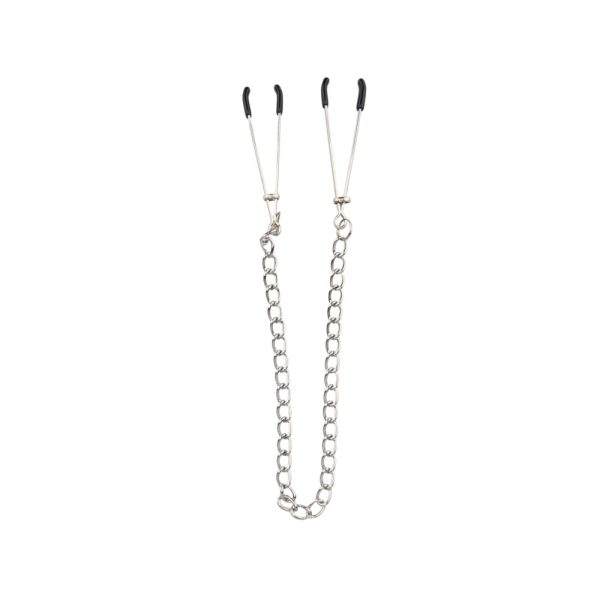 The perfect entry-level nipple clamp set, these tweezer style clamps provide the perfect combination of small surface area for pin-point pressure and rubberised tips for comfort. Connected by a silver, link chain, the metal links also add sensory arousal when against skin. Chain Length: 27 cm