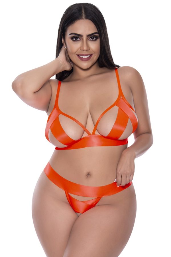 From the Exposed by Magic Silk Collection, this style includes: A bra featuring thick bondage style strappy bra cups, adjustable shoulder straps with metal sliders, O-ring details, a hook & eye closure at the back, and a matching crotchless panty. Plush satin elastic straps with a slight sheen. Hand wash, cold. No Bleach. Dry flat. 90% Nylon, 10% Spandex