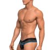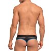 Low rise thong, elasticized concealed fly, easy access clip pouch, plush elastic branded waistband, color coordinating trim.