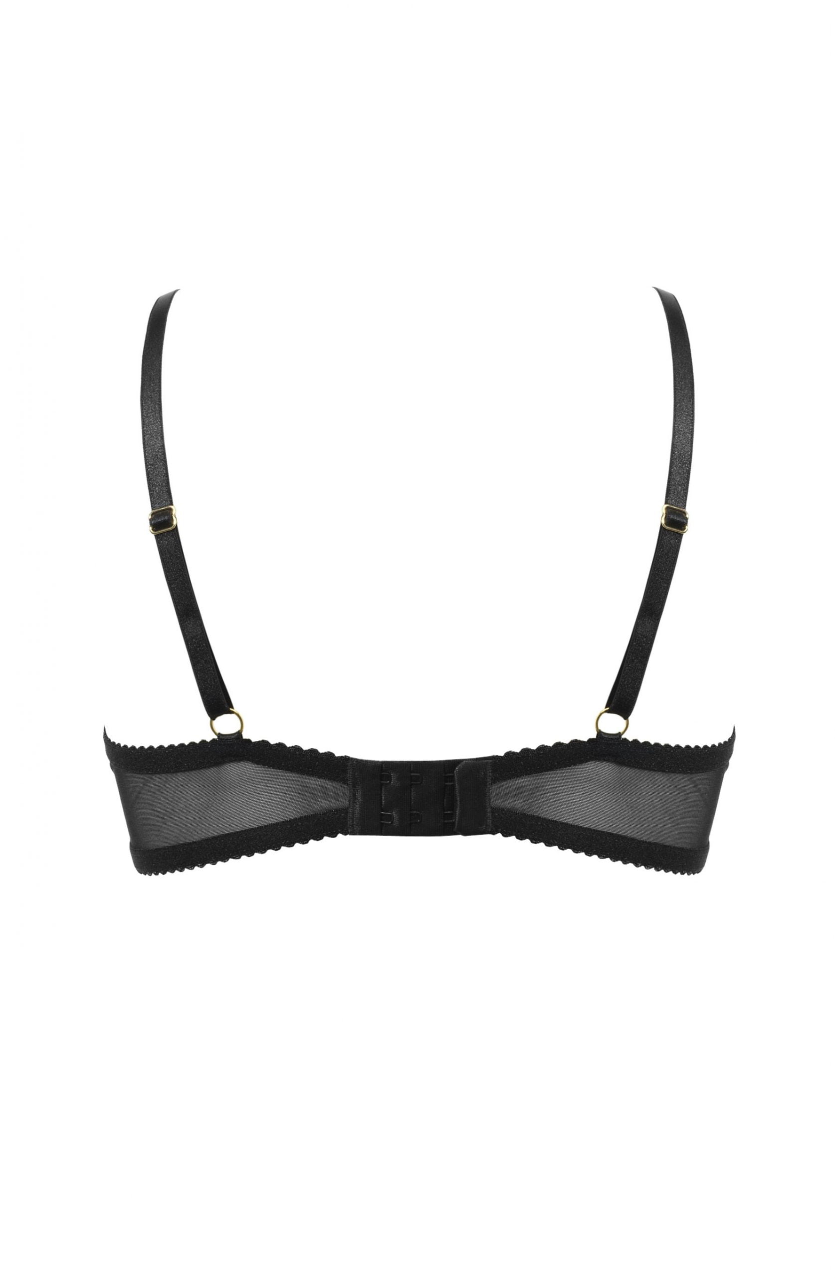 Seductive bra crafted from the finest of materials. Cheeky peep hole effect on the cups with underwiring for support. Small ribbon bow sits in the middle. Lovely adjustable straps with gold coloured metal fittings and adjustable fastener with three position.
