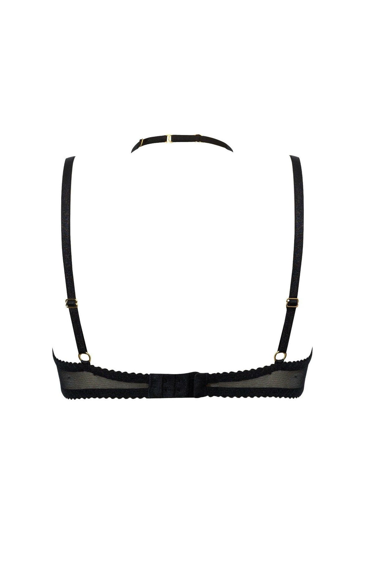 Sexy red and black bra made with black eyelash lace detail. Halter neck style strap detail which is fully adjustable (fixed to the centre of the bra so not removable) Fully adjustable shoulder straps with sold gold coloured metal fittings. Super sexy and unique!
