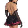 A super soft stretch lace three piece set. Comprising chaps! split cup tie top and open front thong! A lot of lace in this stunning set. Arrives packaged in a lovely Shirley of Hollywood box.