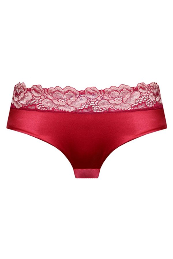 Lined satin front hipster for light tummy smoothing, mesh back for no panty lines, two toned stretch lace and features a satin trimmed keyhole with a metal button on the back
