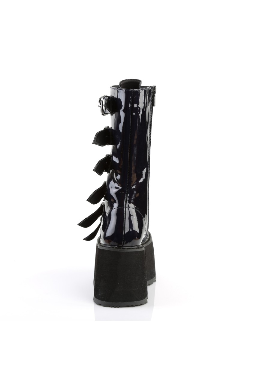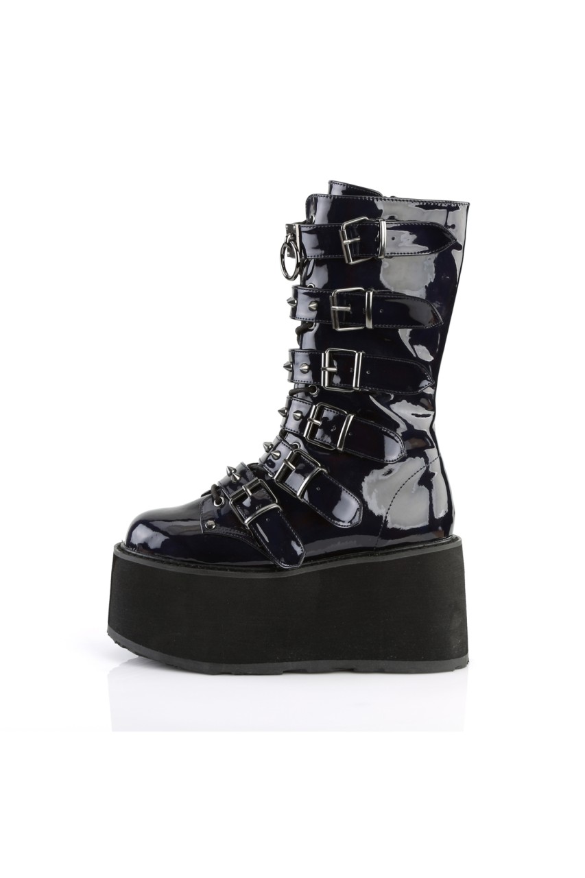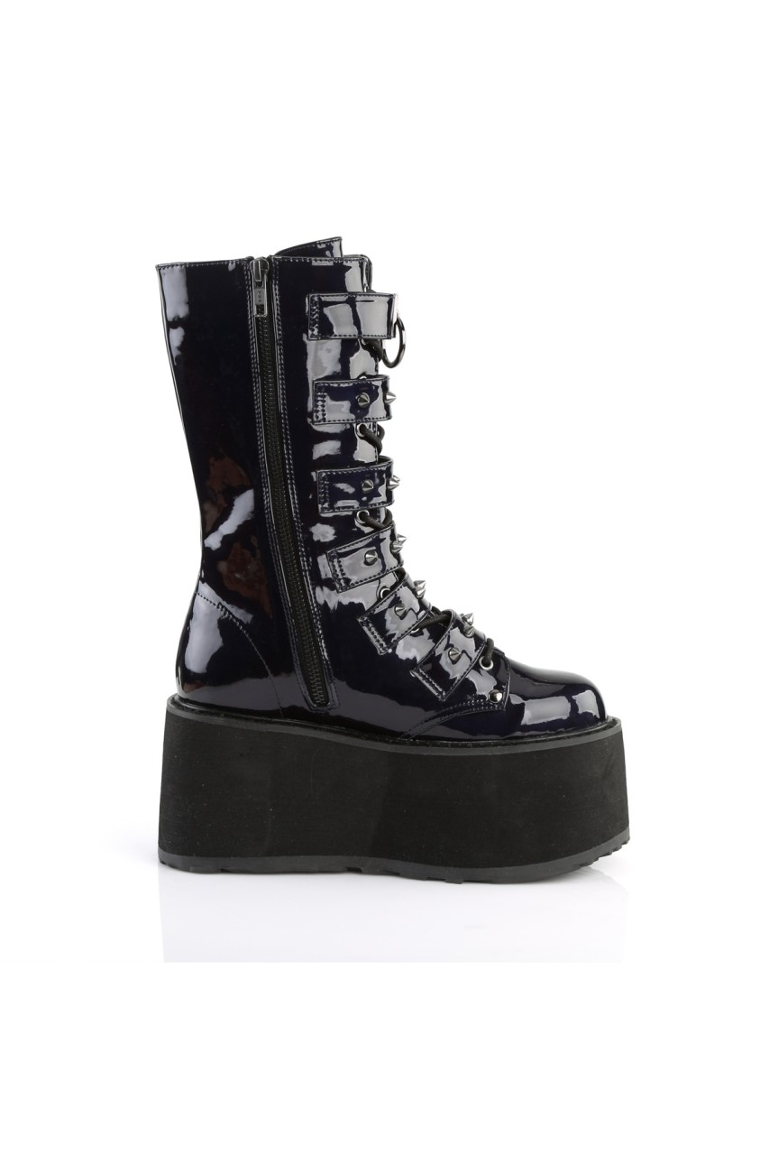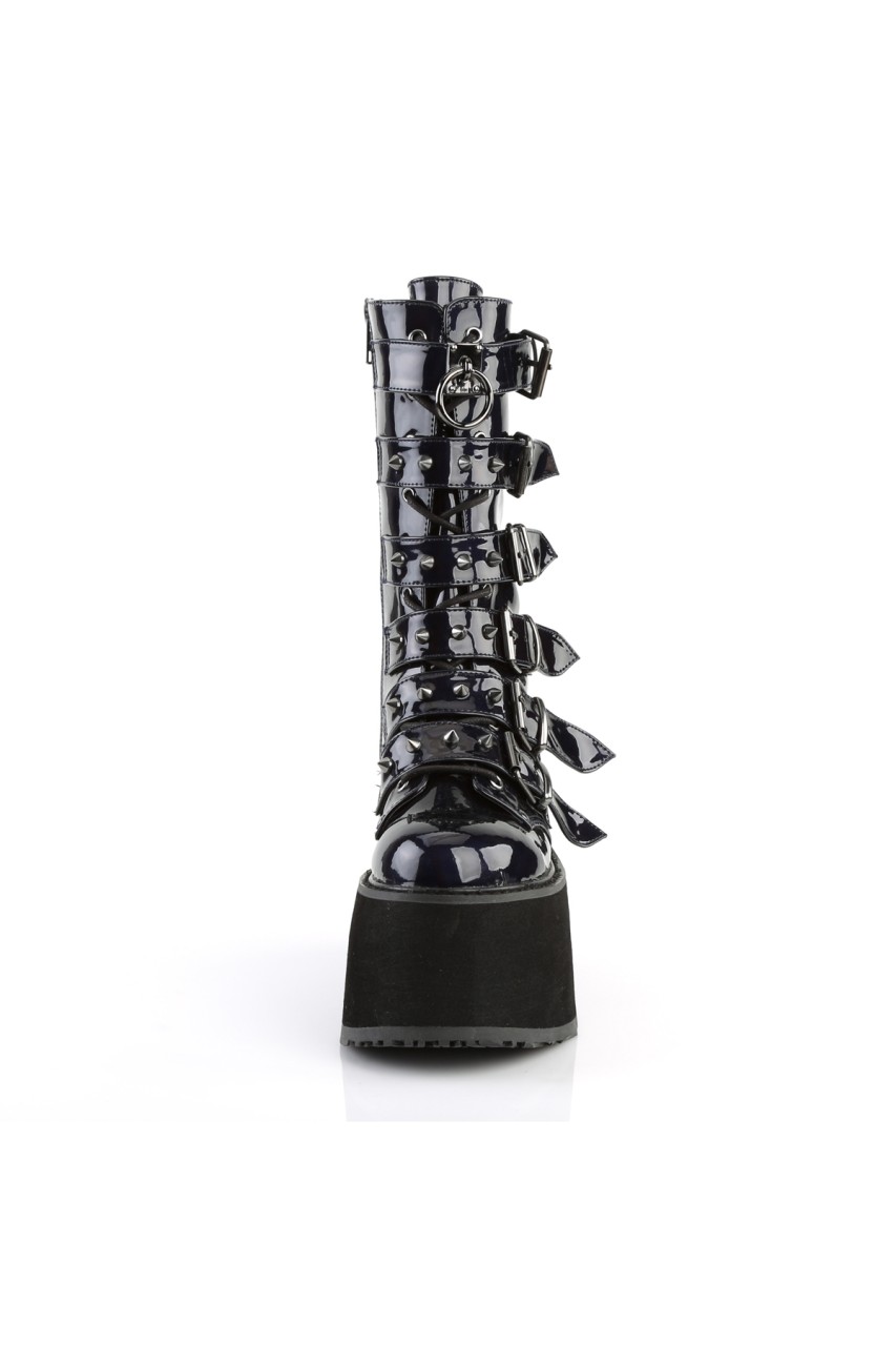 3 1/2″” (90mm) Platform Lace-Up Front Mid-Calf Boot Featuring 6 Cone-Studded Buckle Straps, Inner Side Metal Zip Closure