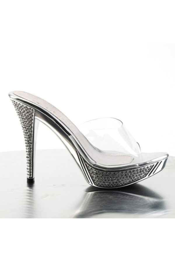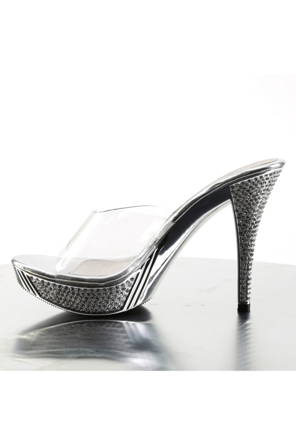 4 1/2″” (11.4cm) Heel, 1″” (2.5cm) Platform Slide Featuring Rhinestone Embellished Heel and Platform