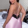 Shiny satin chemise with lace trim, inserts, and hem, multi-way ties, satin bow detail, and thong
