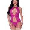 From the Exposed by Magic Silk collection, this style includes: a halter style basque featuring elastic adjustable shoulder straps with gold tone sliders, silk lace-up ribbon in the back, gold tone swan hook closure in the lower front, removable adjustable garters with gold tone sliders, and a matching lace g-string. Hand Wash Cold. No Bleach. Dry Flat. Lace: 90% Nylon, 10% Spandex Mesh: 84% Polyester, 16% Spandex