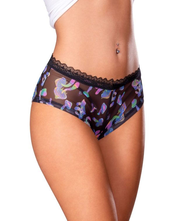 From the Exposed by Magic Silk collection, this style includes: A boy short featuring blacklight reactive rainbow mushroom print and purl edges. Hand Wash Cold. No Bleach. Dry Flat. 89% Polyester / 11% Spandex