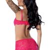 From the Exposed by Magic Silk collection, this style includes: A stretchy lace bra featuring a satin ribbon bow, hook & eye closures in the back, adjustable shoulder straps with gold tone sliders, and a matching thong and lace skirt with scalloped edges. Stretch lace galloons placed to maximize the flirty scalloped edges, finished with soft, shiny elastic strap details, blacklight reactive. Hand Wash Cold. No Bleach. Dry Flat. 90% Nylon / 10% Spandex