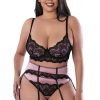 From the Exposed by Magic Silk collection, this style includes: a lace demi bra featuring underwire and hook & eye closure, elastic adjustable shoulder straps with gold tone silders, a satin cincher with attached adjustable garter straps and gold tone sliders, hook & eye closure in the back, and a matching lace and satin thong. Deco-inspired black scalloped stretch lace is paired with a rich mauve silky-soft stretch satin. Hand Wash Cold. No Bleach. Dry Flat. 76% Nylon 24% Spandex