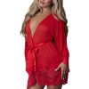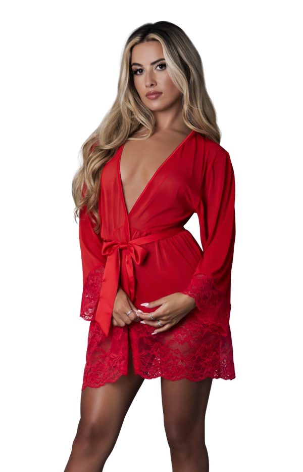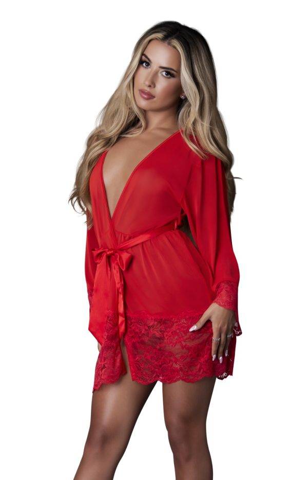 From the Sugar High collection by Magic Silk, this style includes: a sheer mesh 3/4 sleeve robe with scalloped lace trim on the sleeves and hem and satin tie at the waist.