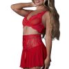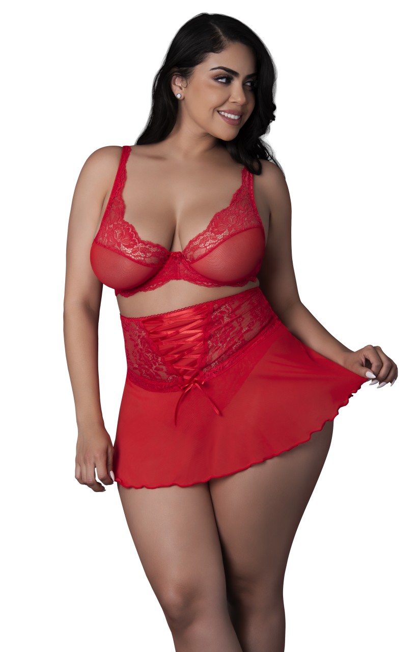 From the Sugar High collection by Magic Silk, this style includes: a sheer mesh and lace bralette with underwire, satin bow, hook and eye closure and adjustable gold sliders, sheer mesh and lace cinch skirt with satin tie and thong.