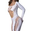 From the Seamless collection by Magic Silk, this style includes: a long sleeve above the knee dress adorned with rhinestones with a large middle cutout and smaller cutouts. This stretchy style can conform to any body type and is extremely flattering! This garment is blacklight reactive.
