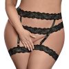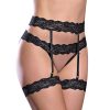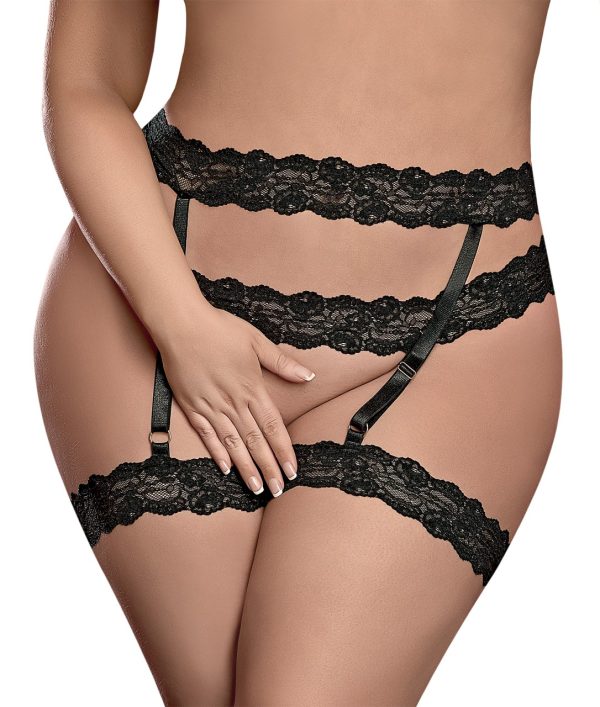From the Lace Panty by Magic Silk Collection, this style includes: a garter belt with attached adjustable garter straps, and metal garter clips, a matching crotchless panty with an open back. Hand wash, cold. No Bleach. Dry flat. Mesh:87% Polyester, 13% Elastane: Lace:90% Nylon, 10% Elastane
