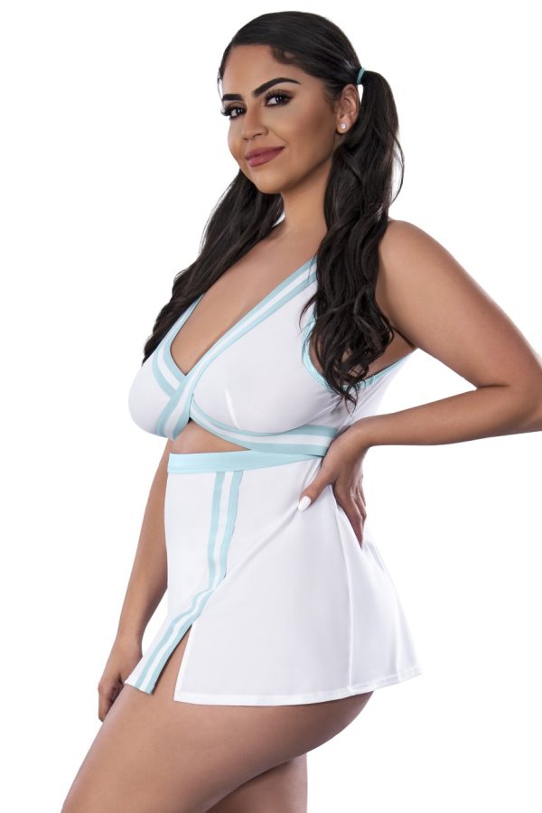 From the Exposed by Magic Silk collection, this style includes: a sporty dress featuring a cross front, elastic straps in the back, and a matching g-string. Lt. blue and white soft stretch jersey paired with white lace and blue/white striped elastic. Hand Wash Cold. No Bleach. Dry Flat.