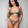 Very daring bra and open string set designed to flatter the lines of the figure and leave nothing to the imagination! Made with elastic straps and decorated in bows adorned with beautiful rhinestones. Garter included. Gloves not included. This item arrives packed in a Provocative box.