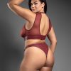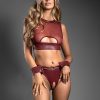 Embossed faux leather and sheer mesh cut-out top, crotchless panty with o-ring detail and matching handcuffs; gold hardware
