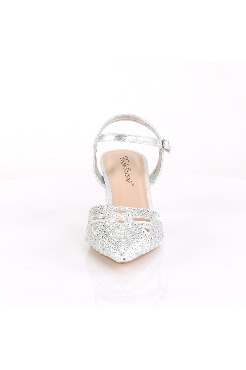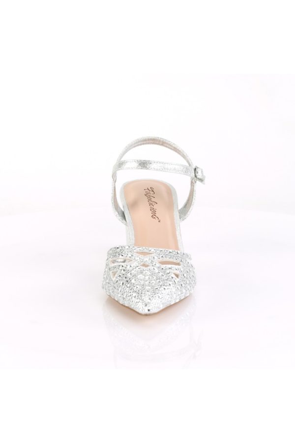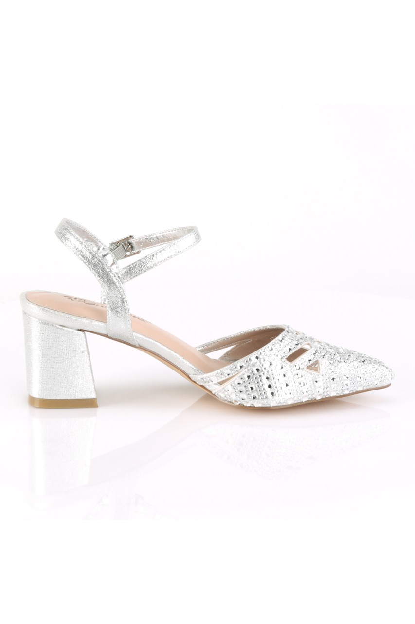 2 3/4″” (70mm) Block Heel Pointed Toe Open Back Ankle Strap Pump w/ Rhinestone Studded Vamp