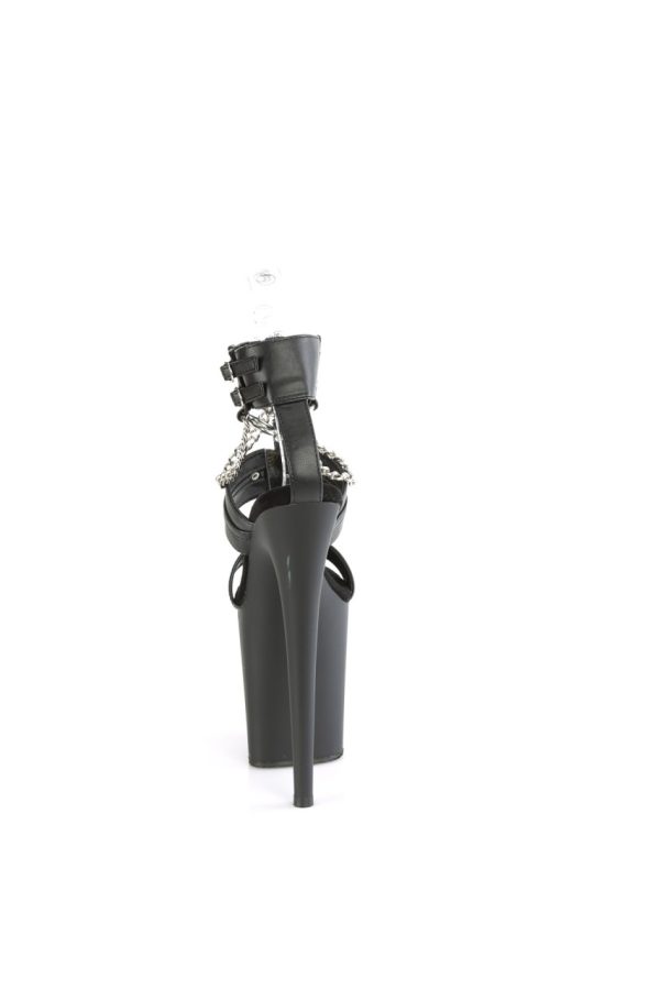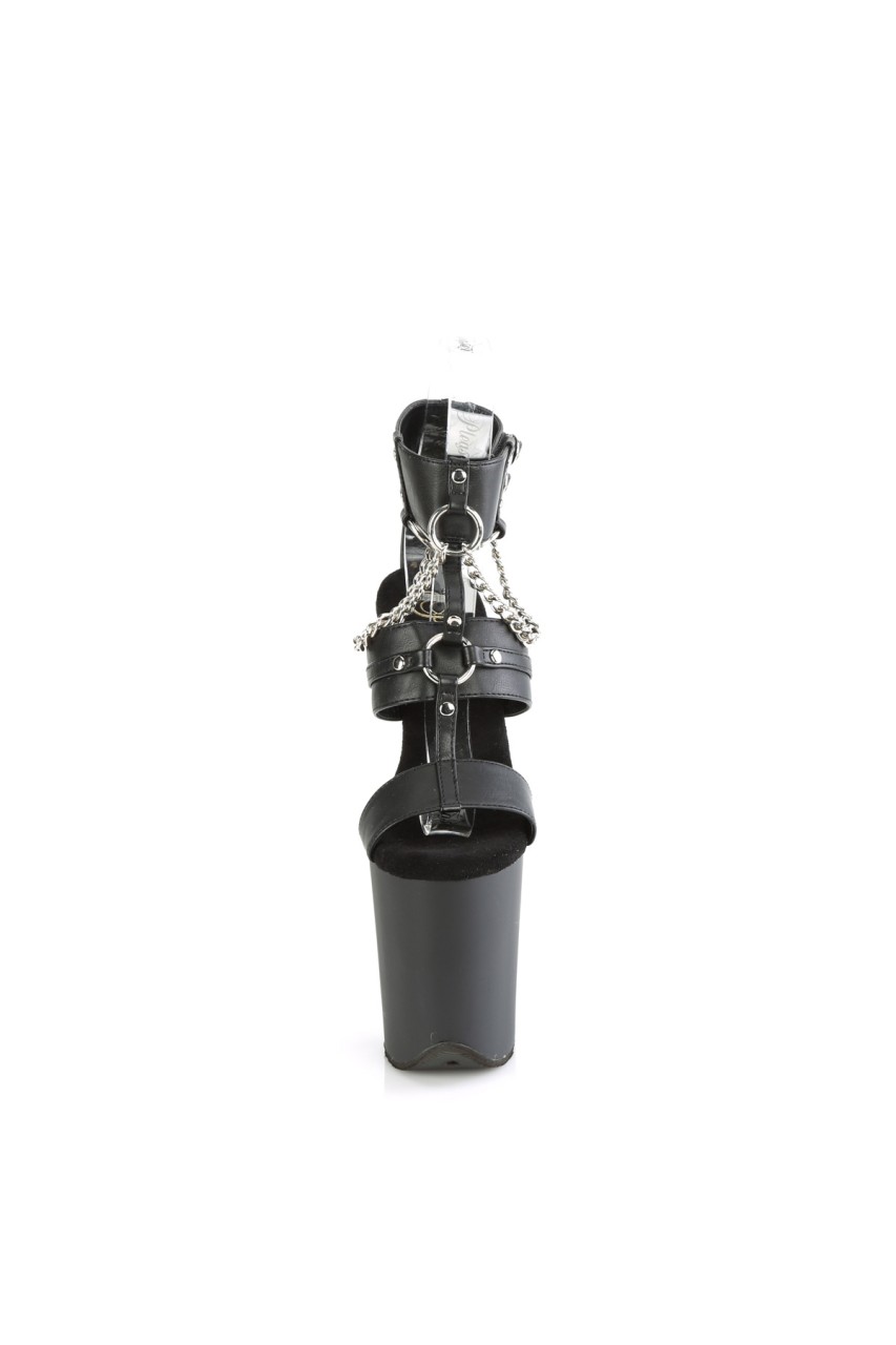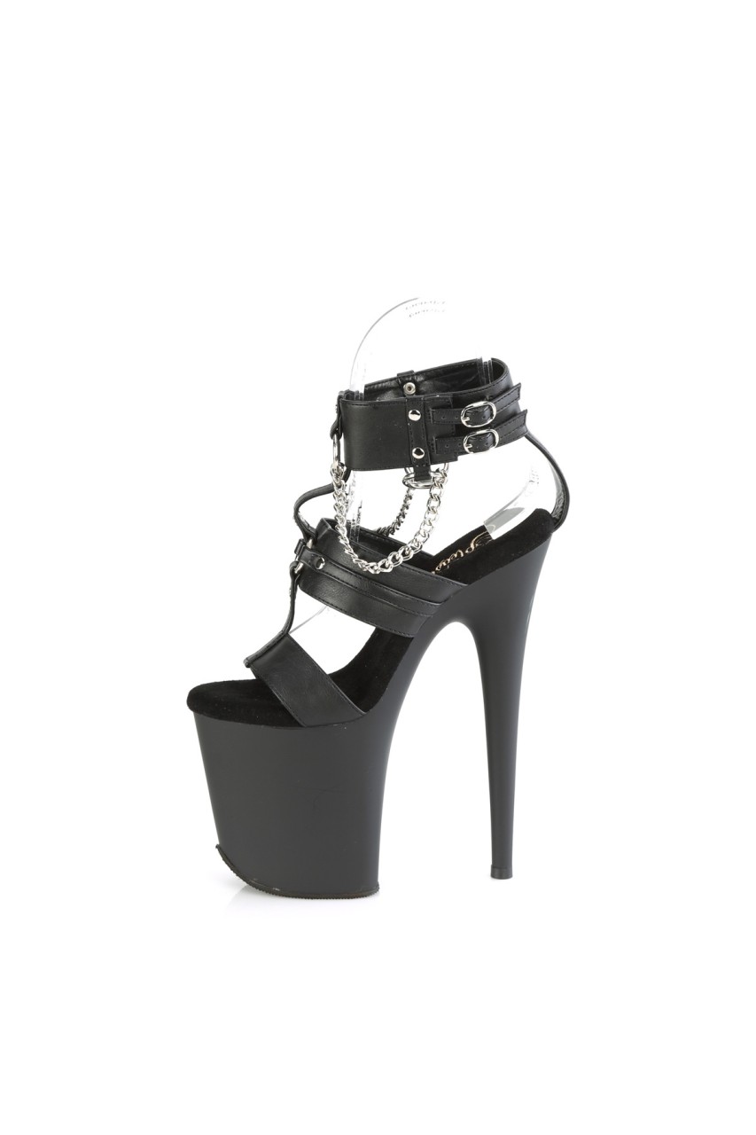 8″” (200mm) Heel, 4″” (100mm) Platform Triple Band T-Strap Dual Ankle Buckled Sandal W/Metal O-Rings, Studs & Chains Detail