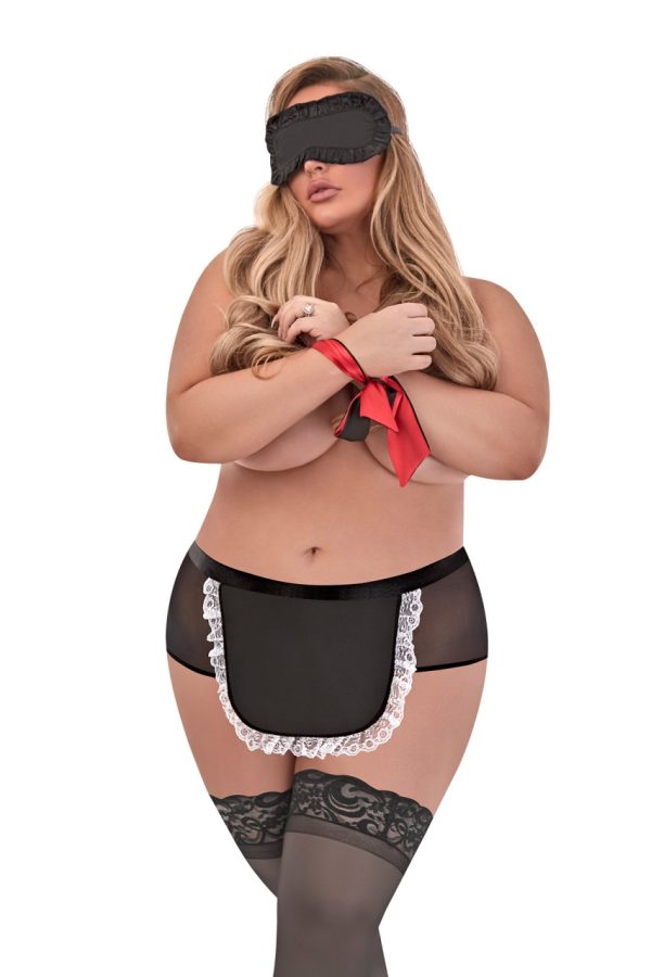 From the Love & Bondage collection by Magic Silk, this style includes: an open crotch panty with a sewn on apron, lace detail in the back and metal clip closure, a satin blindfold with ruffle trim and plush elastic strap and one 40 inch satin easy-tie bondage restraint. Garment: Enigmatic ebony mesh accented with milky white lace. Bondage Set: Sultry satin fabric. Hand wash, cold. No Bleach. Dry flat.