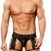Lace garter short features mesh pouch with cire trim, thick floral lace waistband with matching garters attached to plush elastic leg holes and g-string back.