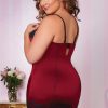 Stretch satin chemise with molded balconette cups, adjustable picot elastic straps, keyhole back, hook and eye back closure, satin covered buttons and stretch lace detailing, princess seams, removable garters and thong