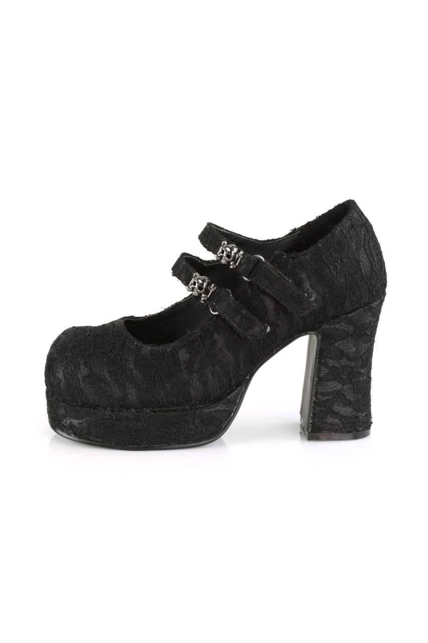 3 3/4″” (95mm) Heel, 1 1/4″” (32mm) Platform Double Hook N’ Loop Strap Maryjane w/ Skull & Cross Bone Metal Ornaments