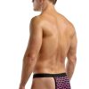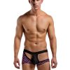 Cut out mini short with single open hip, solid pouch and trim combined with two toned printed fabric. Plush tone on tone branded elastic waistband.