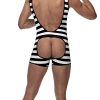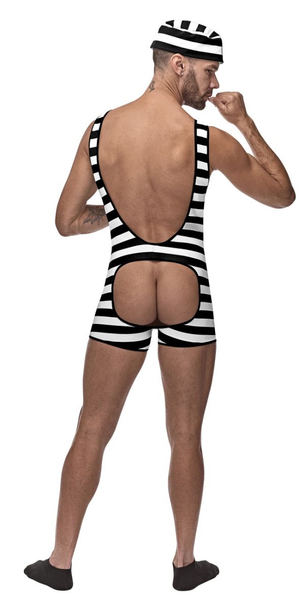 From the Costumes collection by Male Power, this style includes: A prisoner themed one-piece singlet with a cutout rear, low-cut back, prisoner patch #, and a matching cap. Smooth nylon with four way stretch spandex , plush elastic trim Hand Wash Separately, Cold Water, Line Dry, Do Not Bleach