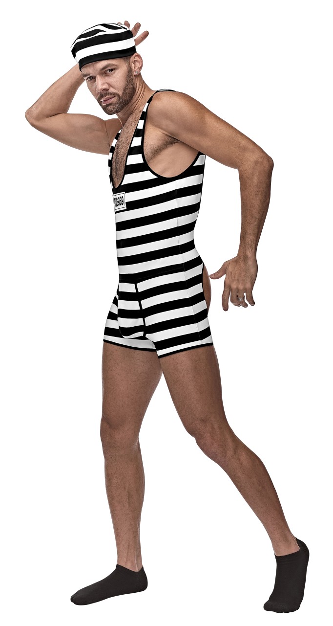 From the Costumes collection by Male Power, this style includes: A prisoner themed one-piece singlet with a cutout rear, low-cut back, prisoner patch #, and a matching cap. Smooth nylon with four way stretch spandex , plush elastic trim Hand Wash Separately, Cold Water, Line Dry, Do Not Bleach