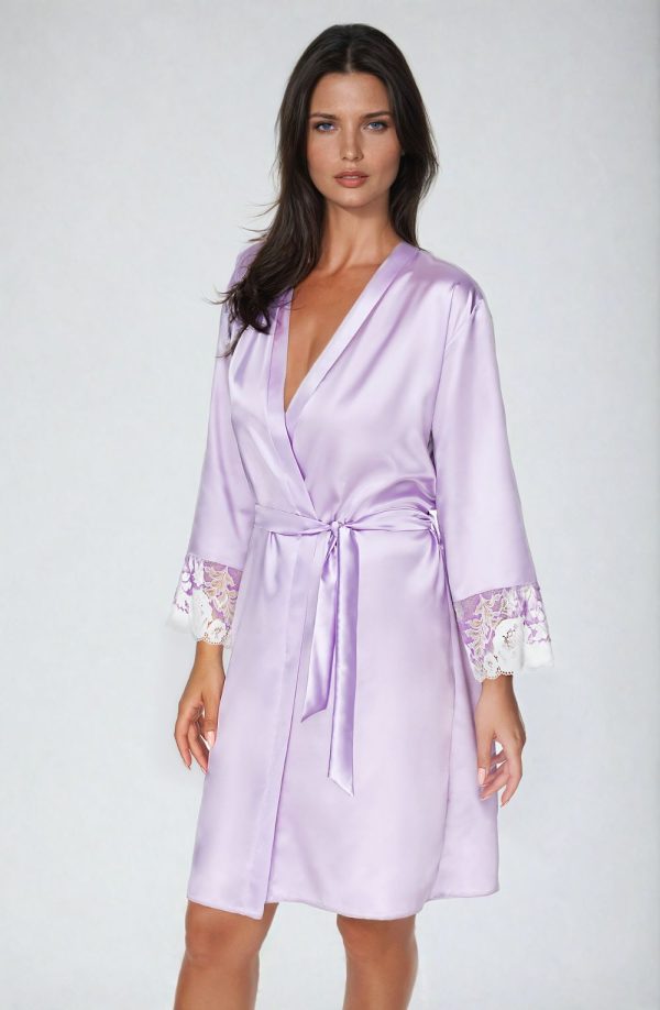 A charming and original knee length dressing gown made of the highest quality satin combined with a beautiful lavender and cream lace in a floral pattern. Andromeda arrives packaged in a lovely Irall box making it ideal for a special gift or treat. Also available in other styles. The Andromeda collection comprises Nightdress Set or Dressing Gown making it ideal for mix and match. Please see the ‘related products tab’ for these further styles.
