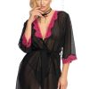 A lovely robe made from slightly transparent chiffon. The collar and cuffs are decorated with beautiful pink lace. The dressing gown is tied with a matching black belt. This item arrives packaged in a lovely Irall box. Please note the thong is not included but is available with the matching babydoll which is available separately, please see related products.