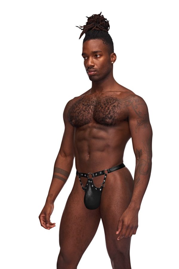 Jouster features g-thong with elongated contour fit pouch, cire waistband with rings, decorative studs and g-string back.
