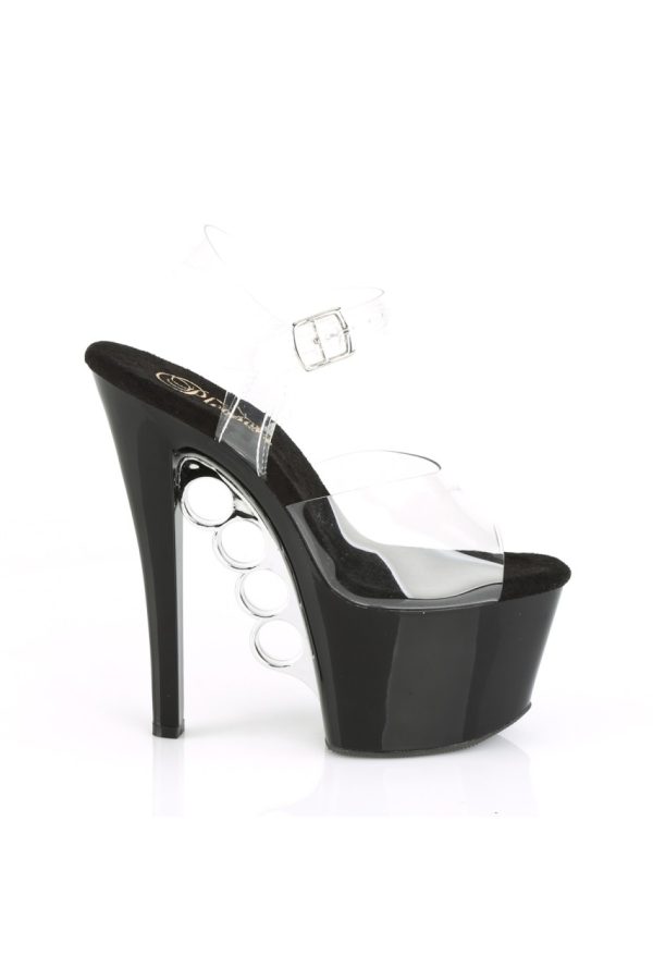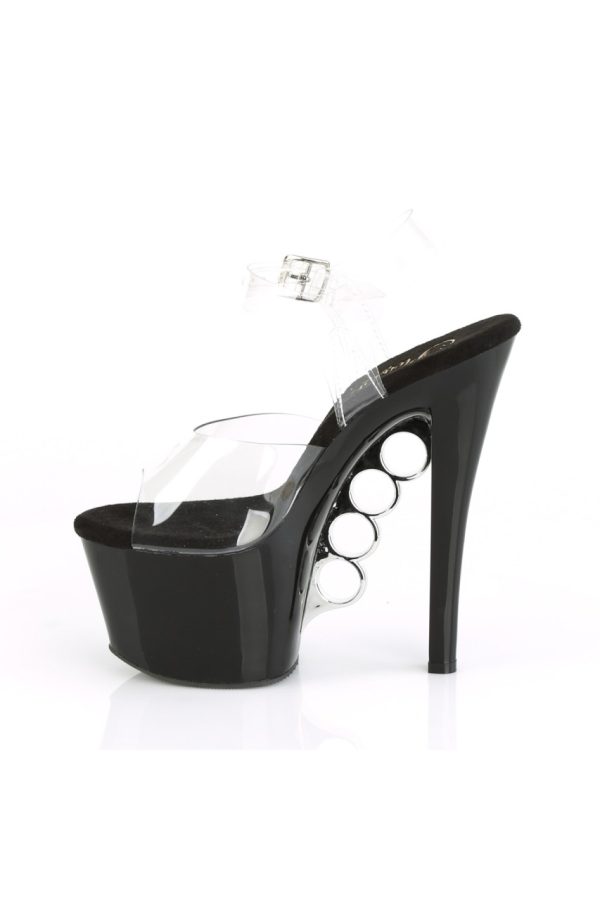 7″” (178mm) Heel, 2 3/4″” (70mm) Platform Ankle Strap Sandal Featuring Chrome Plated Brass Knuckles on the Platform Underside
